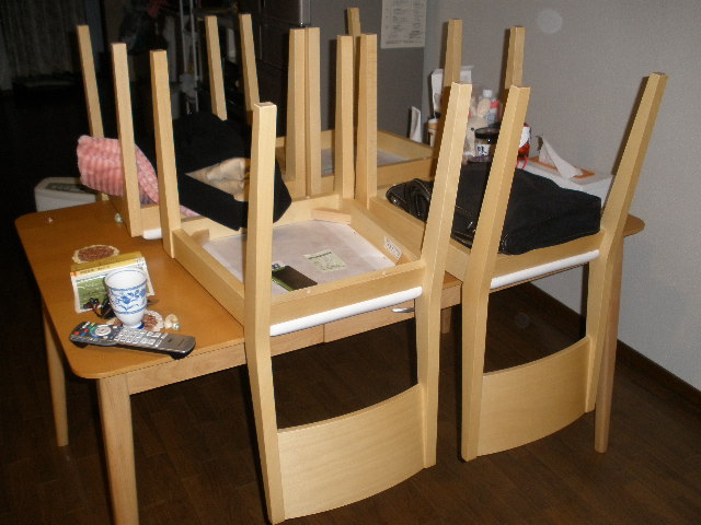| 机の椅子なんかも、こんな感じで上に上げておきます。椅子の足は、結構ルンバの妨げになると思われます。 |
